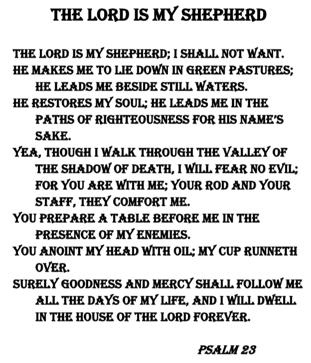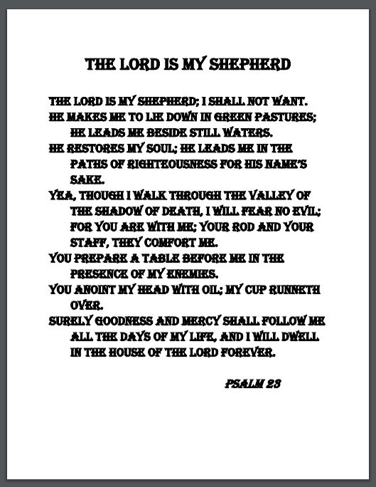 23rd Psalm 8″x10″ Share this: Click to share on X (Opens in new window) X Click to share on Facebook (Opens in new window) Facebook Like Loading... Related